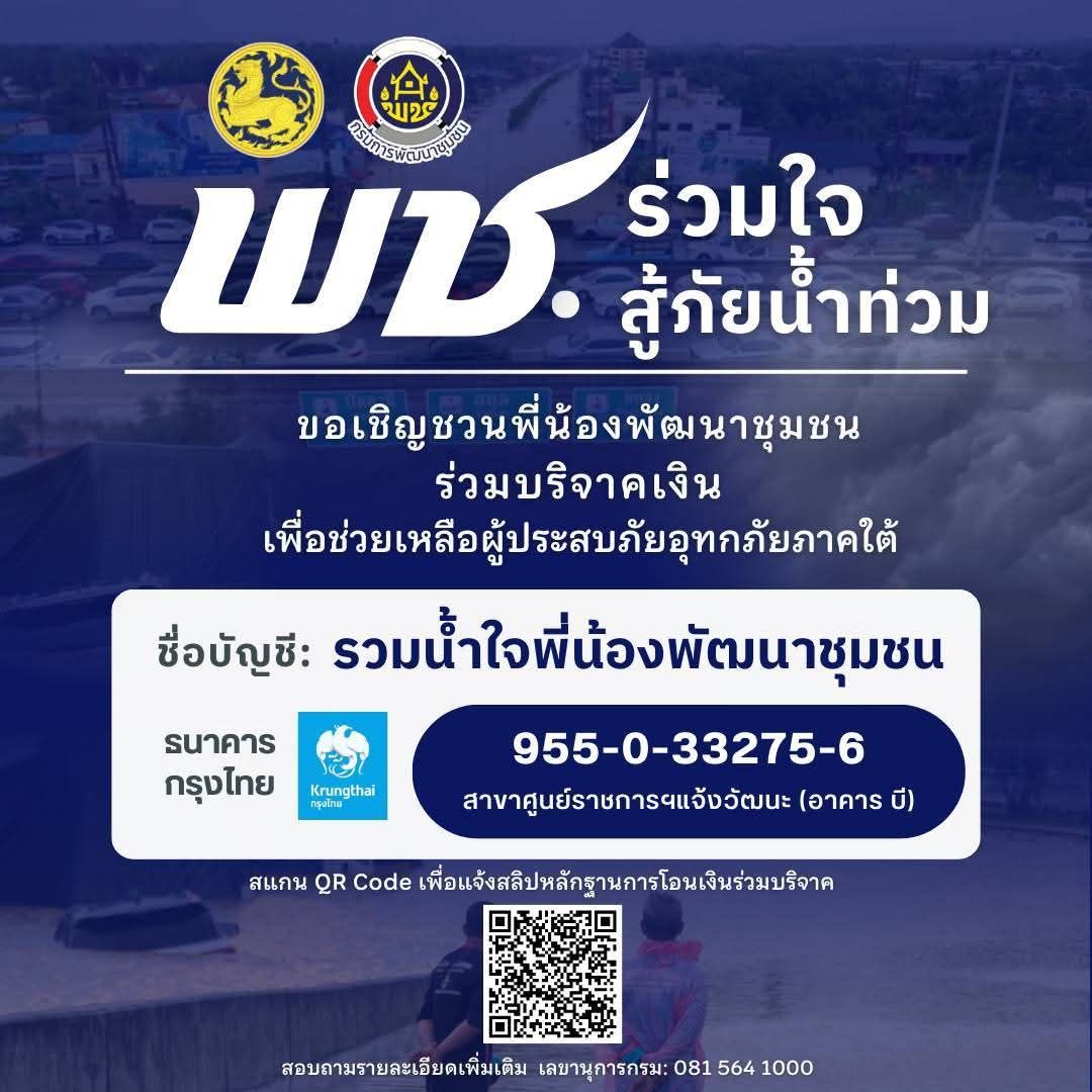 พช.ร่วมใจ สู้ภัยน้ำท่วม ขอเชิญพี่น้องพัฒนาชุมชนร่วมบริจาคช่วยเหลือผู้ประสบภัยอุทกภัยภาคใต้